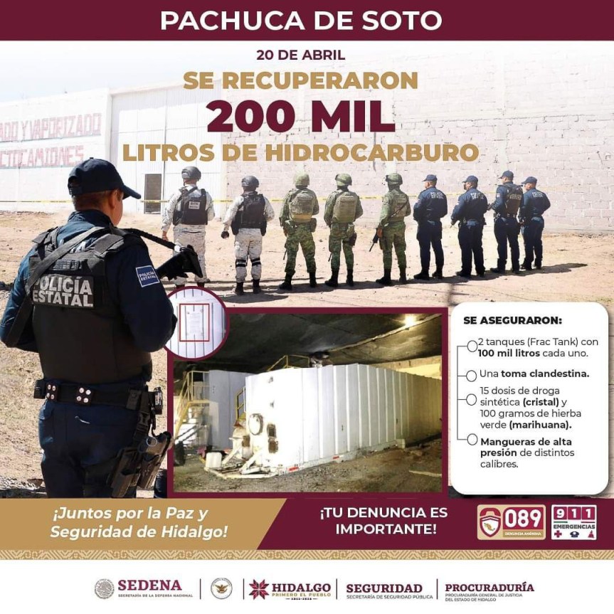 En el marco de las tareas para contribuir en la reconstrucción de la paz, la Secretaría de Seguridad Pública en coordinación con la Procuraduría General de Justicia del Estado de Hidalgo, apoyados por Sedena y Guardia Nacional, llevaron a cabo un operativo donde se recuperaron 200 mil litros de hidrocarburo y se aseguró una toma clandestina.