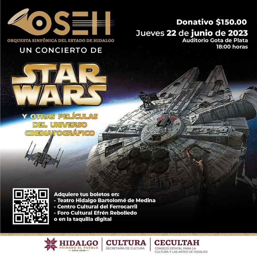 La Secretaría de Cultura y el Consejo Estatal para la Cultura y las Artes de Hidalgo (Cecultah) anunciaron la realización del concierto “Star Wars y otras películas del mundo cinematográfico”, que se llevará a cabo el próximo 22 de junio, a las 18:00 horas, en el auditorio Gota de Plata y estará a cargo de la Orquesta Sinfónica del Estado de Hidalgo (OSEH).