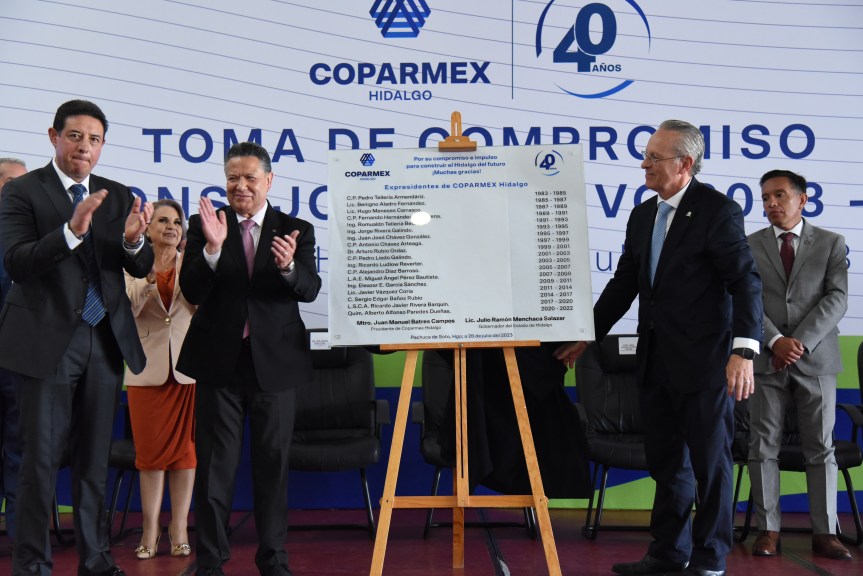 En este marco, el titular del Ejecutivo estatal participó en la entrega de reconocimientos a los expresidentes de Coparmex Hidalgo, además de develar la placa conmemorativa del 40 aniversario de dicha organización empresarial en la entidad.