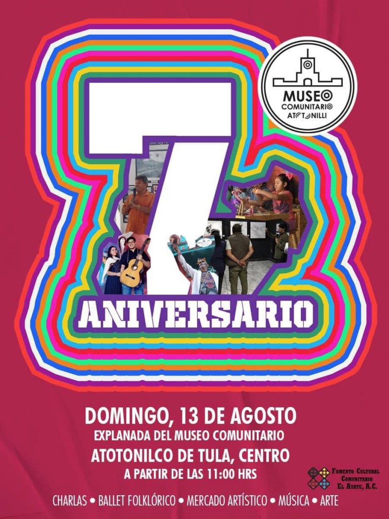 La Secretaría de Cultura, a través de la Red Estatal de Museos, invita a la población en general a la celebración del séptimo aniversario del Museo Comunitario Atotonilli, que trabaja en la preservación del patrimonio cultural del municipio de Atotonilco de Tula y es un espacio abierto que suma esfuerzos para hacer de su historia, tradición y cultura, la principal fortaleza de la sociedad.