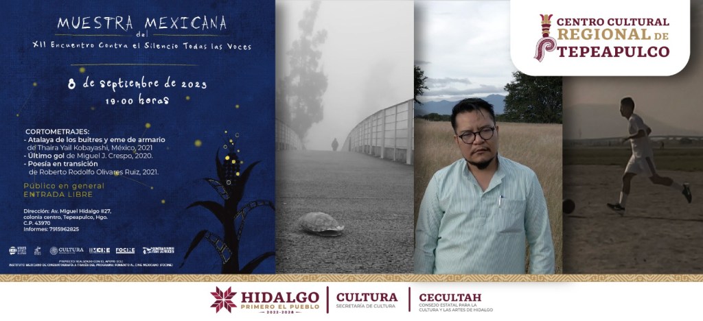 De esta manera es que en dicha muestra mexicana de cine se realizará la proyección de obras audiovisuales contemporáneas, el 8 de septiembre los cortometrajes: Atalaya de los buitres y eme de armario, de Thaira Yail Kobayashi, México, (2021); Último gol, de Miguel J. Crespo, (2020) y Poesía en transición, de Roberto Rodolfo Olivares Ruiz, (2021); mientras que el 22 de septiembre Sin tantos panchos, de Verónica de la Luz, (2019).
