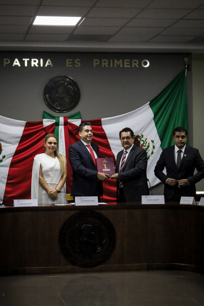 El Primer Informe de labores fue recibido por el actual presidente de la Junta de Gobierno del Congreso del Estado, el diputado Osiris Leines Medécigo, y la presidenta de la Mesa Directiva, la legisladora Sharon Macotela.