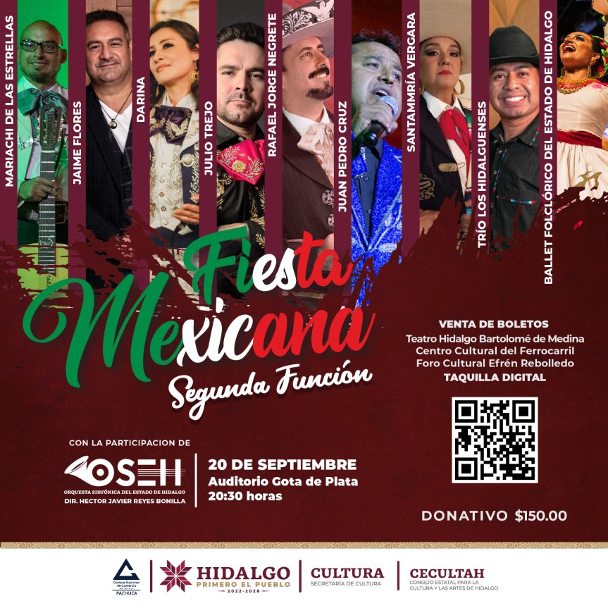 La Orquesta Sinfónica del Estado de Hidalgo (OSEH) anunció un segundo horario para el concierto “Fiesta Mexicana”, este próximo 20 de septiembre en el auditorio Gota de Plata, por lo que tendrá funciones las 18:00 y 20:30 horas.