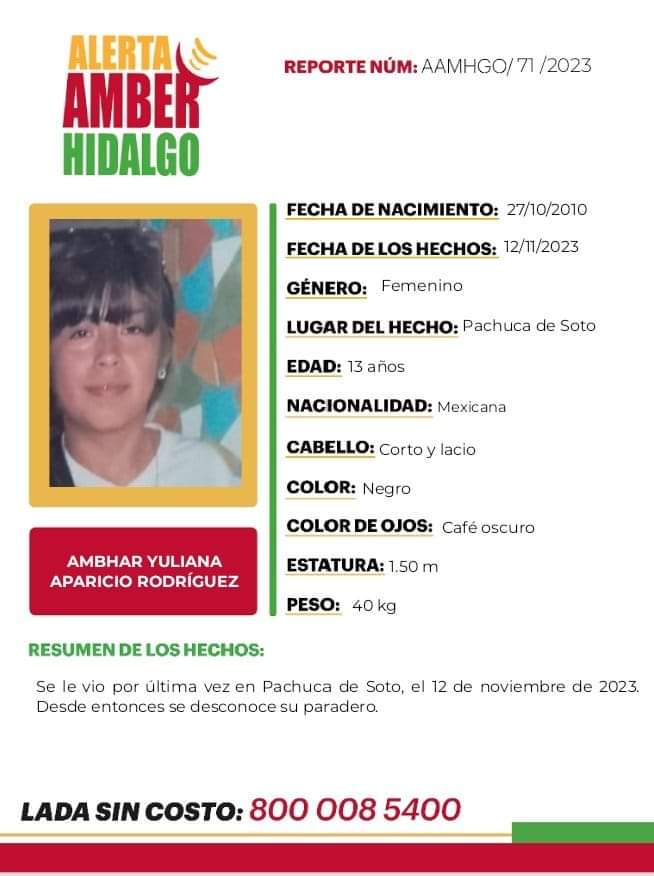 📣 | #ApoyoDeDifusión La menor Ambhar Yuliana Aparicio Rodríguez fue vista por última vez en #Pachuca el 12 de noviembre, sus familiares piden que compartas su ficha de búsqueda para localizarla.