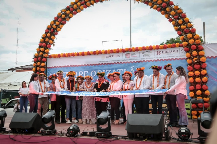 Tania Meza Escorza, secretaria de Cultura en Hidalgo, entregó a Erika Saab Lara, presidenta municipal de San Felipe Orizatlán, el Bastón de Mando para dar inicio con las actividades del XXVI Festival de la Huasteca en la plaza principal del “lugar de arroz”.
