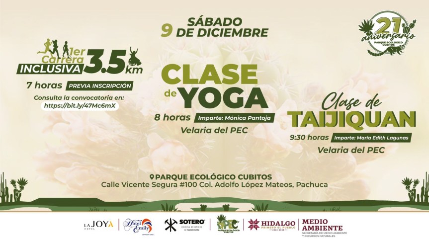 Como parte de las actividades que se desarrollaron en conmemoración al 21 aniversario del Parque Ecológico Cubitos (PEC), la Secretaría de Medio Ambiente y Recursos Naturales de Hidalgo (Semarnath), invita a la población en general, a ser parte del cierre de la celebración este sábado 9 de diciembre.