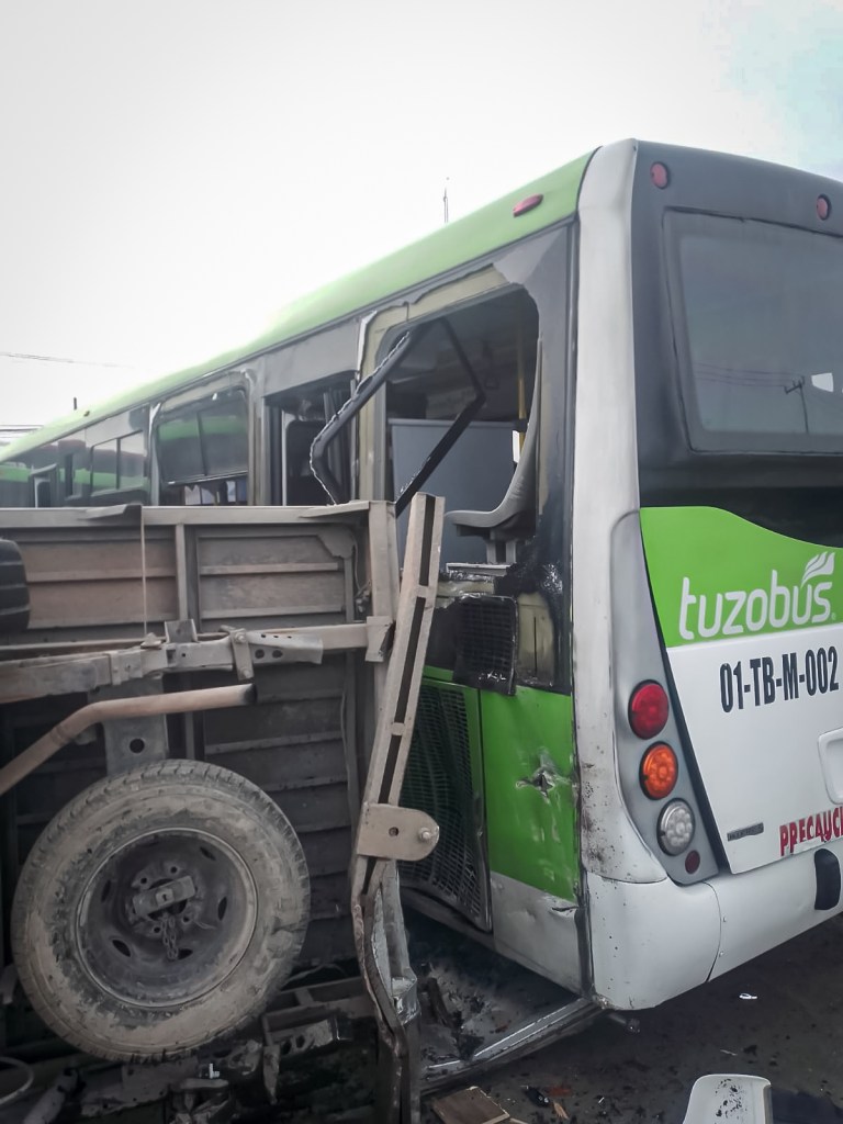 Dos vehículos particulares se impactaron sobre los carriles centrales de la carretera, y uno de ellos Nissan Pickup a causa del incidente volcó e invadió el carril preferente del sistema Tuzobús, llegando a golpear la unidad tipo Gran Viale del servicio T02 con número económico 002, el cual estaba en espera de su incorporación en el retorno operacional antes citado, lo anterior ya que esta ubicación es su punto base de lanzadera.