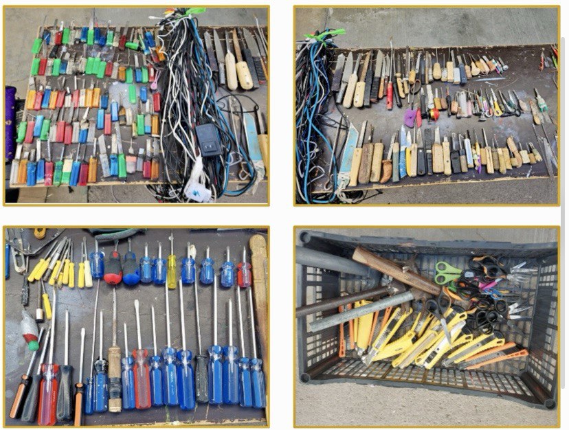 Además, se decomisaron cuatro tablas de castigo, diversos chips telefónicos, 51 memorias USB, ocho adaptadores, memorias SD, 87 bocinas, 48 cargadores y 288 artículos entre los que se encontraban objetos punzocortantes, desarmadores y martillos.