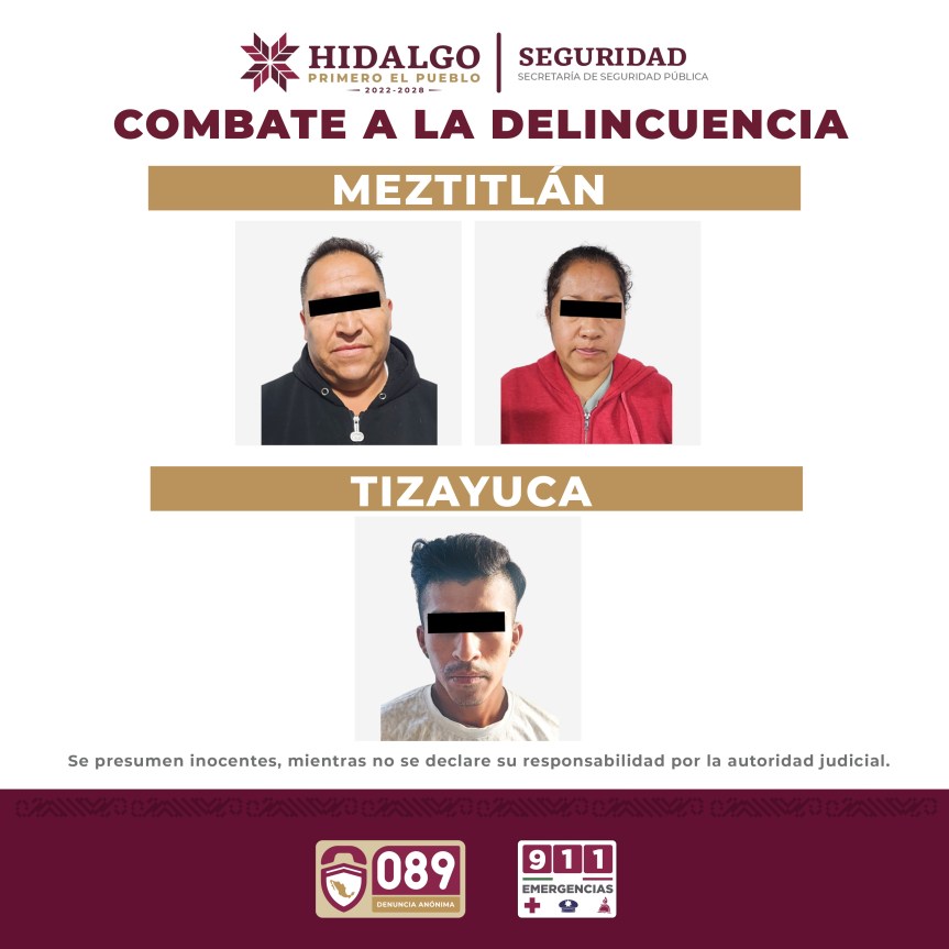 Al menos tres personas presuntamente relacionadas con actividades de narcomenudeo fueron aseguradas por elementos adscritos a la Secretaría de Seguridad Pública de Hidalgo (SSPH) durante la ejecución de un operativo simultáneo en los municipios Metztitlán y Tizayuca.