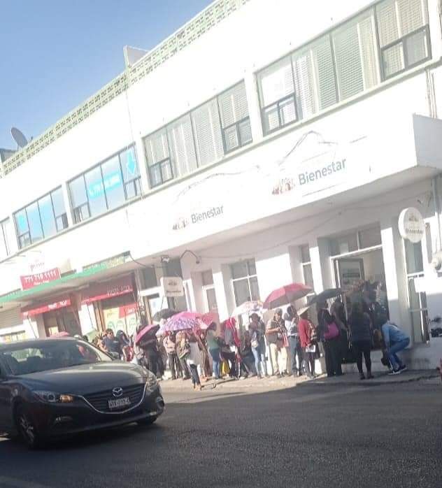 Pachuca, Hgo. Adultos mayores pasan horas bajo el sol y las altas temperaturas, en espera de retirar sus apoyos del Banco Bienestar.