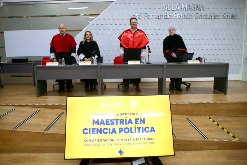 La Escuela Judicial Electoral (EJE) del Tribunal Electoral del Poder Judicial de la Federación (TEPJF) llevó a cabo la ceremonia de entrega de títulos de la Maestría en Ciencia Política, con orientación en materia electoral, modalidad escolarizada, primera generación.