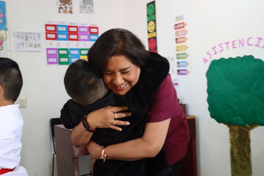 En su visita por la Sierra Alta, la presidenta del Patronato se reunió con el alumnado del Centro de Atención Múltiple (CAM) Número 16 conformado primordialmente por niñas, niños y adolescentes con autismo o síndrome de Down.