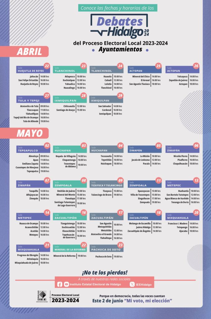 En Conferencia de Prensa, el Instituto Estatal Electoral de Hidalgo (IEEH) dio a conocer las fechas, horarios y sedes en que se llevarán a cabo los Debates del Proceso Electoral 2023 – 2024, tanto para la renovación de las 30 Diputaciones Locales como de los 84 Ayuntamientos.