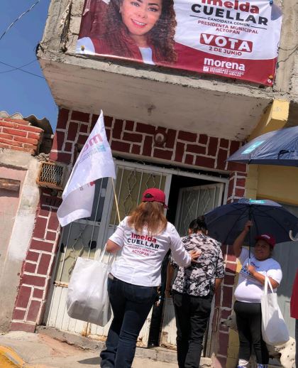 Imelda Cuellar Cano, candidata común a presidenta municipal de Actopan por Morena y Nueva Alianza Hidalgo, encabezó unas brigadas de voluntarios en la colonia Guadalupe, donde escuchó las inquietudes de los vecinos.