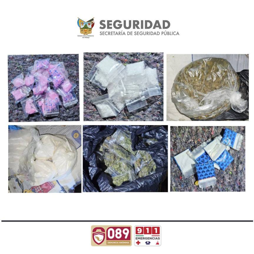Durante las diligencias desarrolladas en coordinación con la Procuraduría General de Justicia del Estado de Hidalgo (PGJEH), Sedena y Guardia Nacional, se decomisaron también un arma de fuego corta, un arma corta de utilería, diversos cartuchos útiles calibre 22, equipo tecnológico y de telefonía celular, dinero en efectivo y utensilios para la dosificación de drogas.