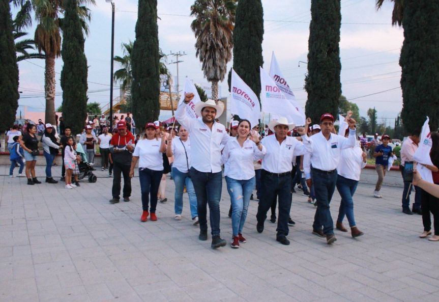 Las candidatas recorrieron la avenida Emiliano Zapata hasta llegar al parque central, donde los asistentes manifestaron su apoyo a los candidatos de la Cuarta Transformación.