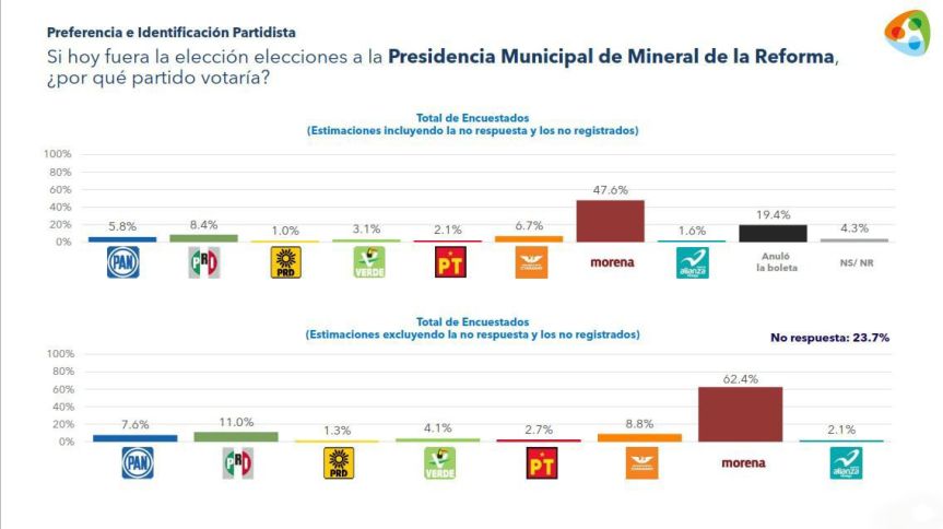 Así lo dio a conocer la casa encuestadora Mendoza Blanco y Asociados S.C., en un sondeo obtenido a través de encuestas realizadas, cara a cara, en domicilios de Mineral de la Reforma y por medio de dispositivos electrónicos.