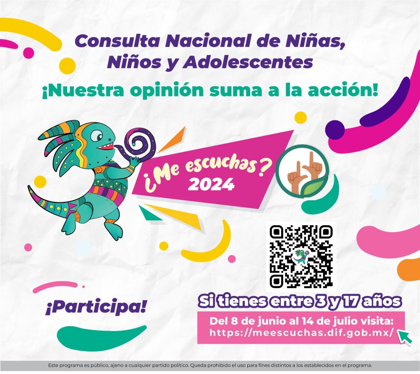 El Sistema para el Desarrollo Integral de la Familia (DIF) de Hidalgo se sumará a la Consulta Nacional ¿Me Escuchas? 2024 actividad participativa promovida por el DIF Nacional que se realizará del 8 de junio al 14 de julio.