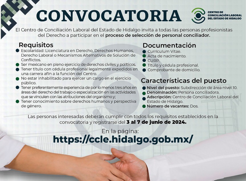 El Centro de Conciliación Laboral del Estado de Hidalgo (CCLEH) difunde su segunda convocatoria pública y abierta 2024 para el proceso de selección del personal conciliador del organismo; informó la directora general del organismo Mariela Valero Mota.