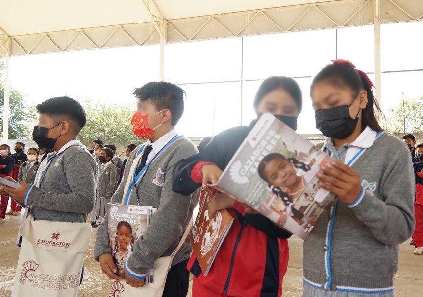 El Instituto Hidalguense de Educación (IHE) entregó 400 ejemplares de la gaceta número 17 de Cazadores de Saberes “Niñas y Niños Preservando su Cultura”, a la comunidad educativa de la primaria bilingüe “16 de septiembre” de la localidad de Los Reyes, Acaxochitlán.