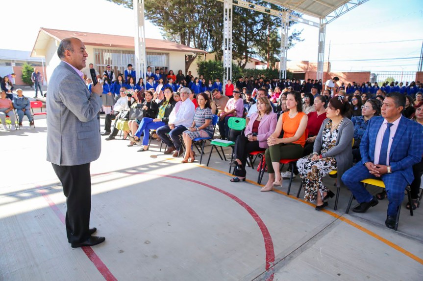 El titular del Instituto Hidalguense de Educación (IHE), Natividad Castrejón Valdez, y el delegado de Programas para el Desarrollo en el estado de Hidalgo, Abraham Mendoza Zenteno, visitaron este martes la Escuela Telesecundaria 377 de Mineral de la Reforma para presenciar el informe de resultados del programa La Escuela es Nuestra.