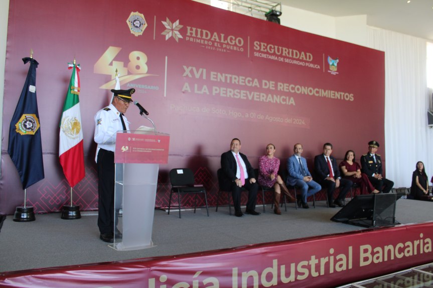 Durante la XVI Entrega de reconocimientos a la perseverancia, el titular de la Policía Industrial Bancaria del Estado de Hidalgo, Francisco Martínez Gómez, también reconoció públicamente con el mérito social a Estefanía Bautista Lara, por recuperar el botín producto de un robo a un cuentahabiente en una sucursal bancaria de la capital del estado.