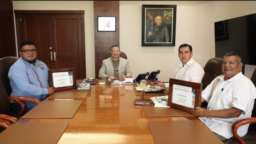 El gobernador de Hidalgo, Julio Menchaca Salazar, y el titular de la Secretaría de Agricultura y Desarrollo Rural estatal, Napoleón González Pérez, se reunieron con Flavio Cisneros Juárez y Suriel Cortés Vázquez, ganadores del Premio a la Pesca y Acuacultura Sustentables, organizado por la Secretaría de Agricultura y Desarrollo Rural federal.