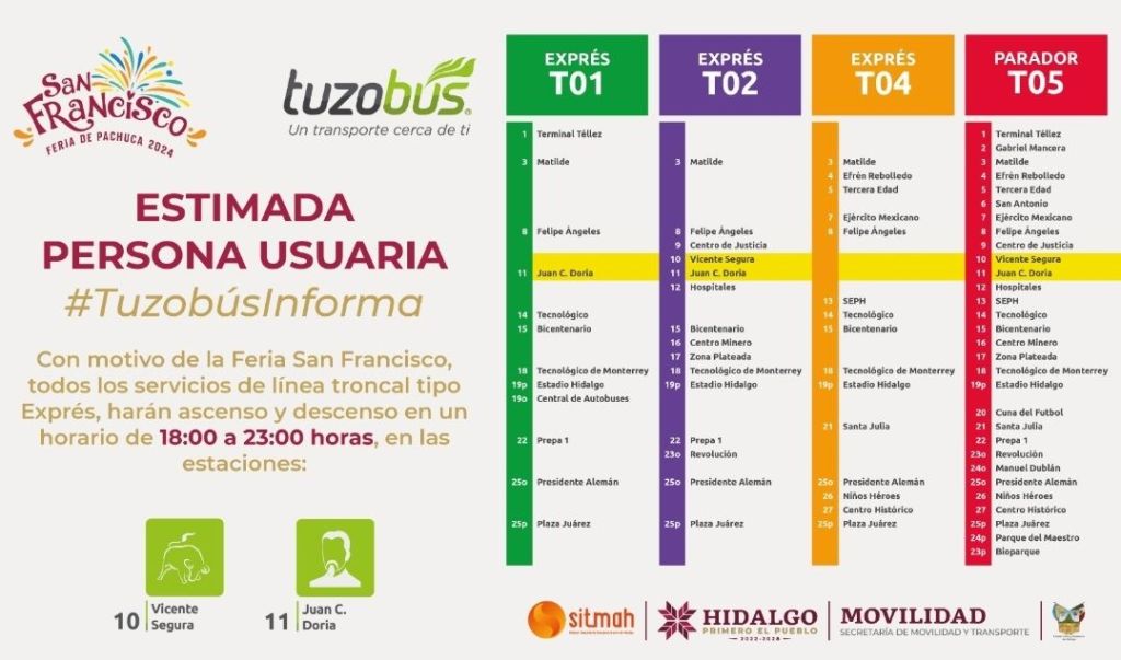 Asimismo, se implementará un servicio especial nocturno con unidades tipo vagoneta que operará desde CETRAM Téllez hasta Centro Histórico, realizando su recorrido por la lateral de Avenida Felipe Ángeles haciendo paradas a la altura de las estaciones del Tuzobús, con un horario extendido de 23:00 a 03:00 horas y un costo de diez pesos.