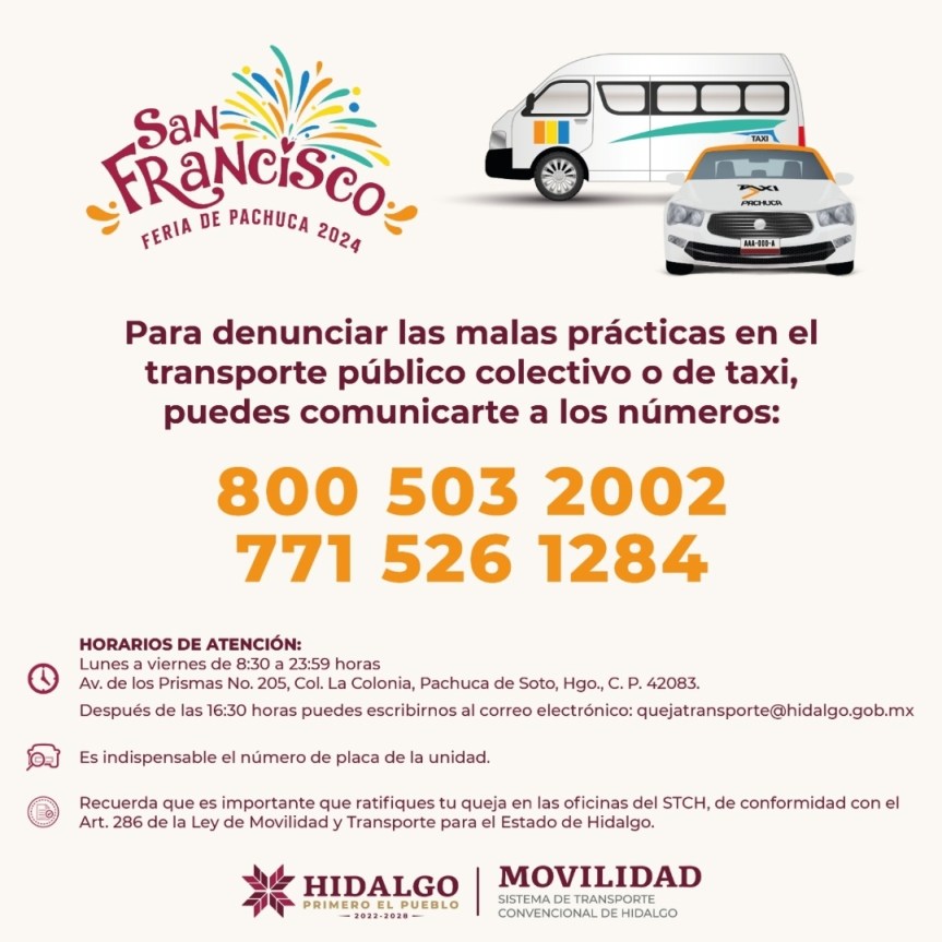 ● Sistema de Transporte Convencional de Hidalgo a través de la línea 800 503 2002, al 771 526 1284 o enviar un correo electrónico a quejatransporte@hidalgo.gob.mx