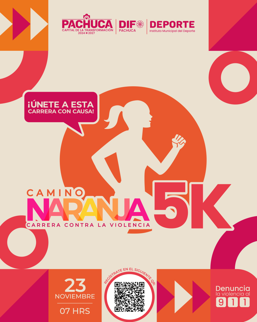 El Sistema para el Desarrollo Integral de las Familias (DIF) Pachuca a cargo de Mariana Mayen Lozada, invita a la población en general a participar en la carrera atlética “Camino Naranja” que se realizará el próximo sábado 23 de noviembre.