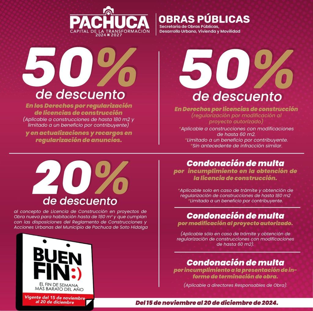 • 20% de descuento al concepto de licencia de construcción en proyectos de obra nueva para habitación hasta de 180 metros cuadrados y que cumplan con las disposiciones del Reglamento de Construcciones y Acciones Urbanas del municipio de Pachuca de Soto.