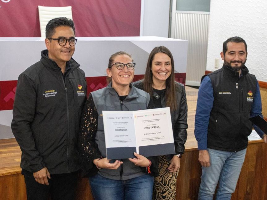El presidente municipal de Mineral de la Reforma, Eduardo Medécigo Rubio, y el director general del Colegio Nacional de Educación Profesional Técnica (Conalep) en Hidalgo, Abel Rojo Muñoz, entregaron constancias del curso “Calidad en el Servicio Público” a trabajadores del Sistema DIF local.