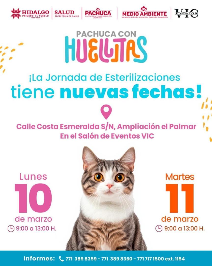 La presidencia municipal de Pachuca, a través de la Secretaría de Medio Ambiente y Desarrollo Sustentable, en coordinación con el sector salud, llevará a cabo una nueva jornada de esterilización los días 10 y 11 de marzo.