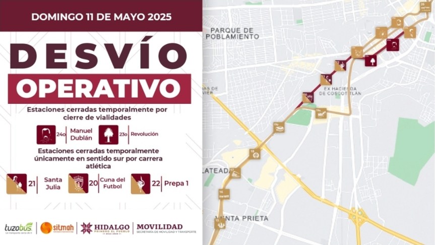 – Recorte operacional a la ruta troncal del Tuzobús, donde se mantendrán cerradas las estaciones Bioparque, Plaza Juárez y Parque del Maestro; asimismo en sentido sur, permanecerán sin servicio las estaciones Cuna de Fútbol, Santa Julia y Prepa 1.