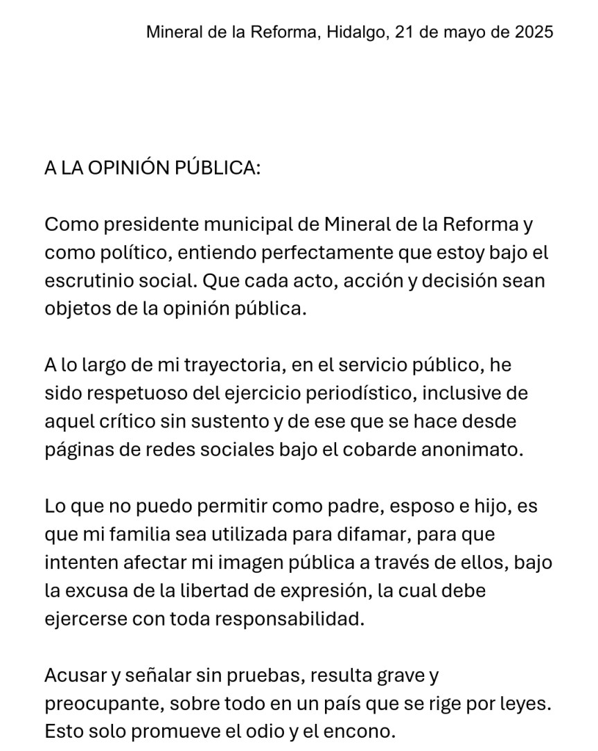 Mineral de la Reforma, Hgo.En un comunicado difundido este martes, el presidente municipal de Mineral de la Reforma, Eduardo Medécigo Rubio, emitió un mensaje dirigido a la opinión pública, en el que manifestó su postura ante recientes críticas y señalamientos difundidos principalmente en redes sociales.