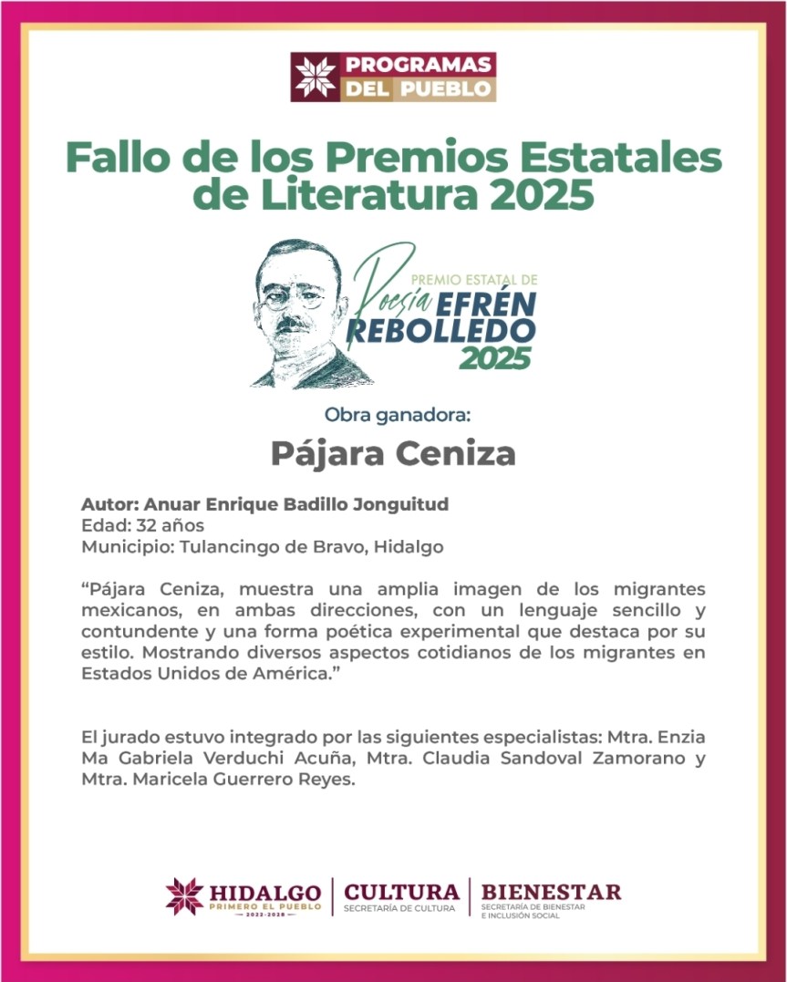 En poesía, el premio fue para Anuar Enrique Badillo Jonguitud, de Tulancingo, con el poemario “Pájara Ceniza”. La obra fue reconocida por su manera de abordar el tema migratorio con un lenguaje sencillo y contundente, además de su propuesta poética experimental que aporta frescura y fuerza a la tradición literaria del estado.