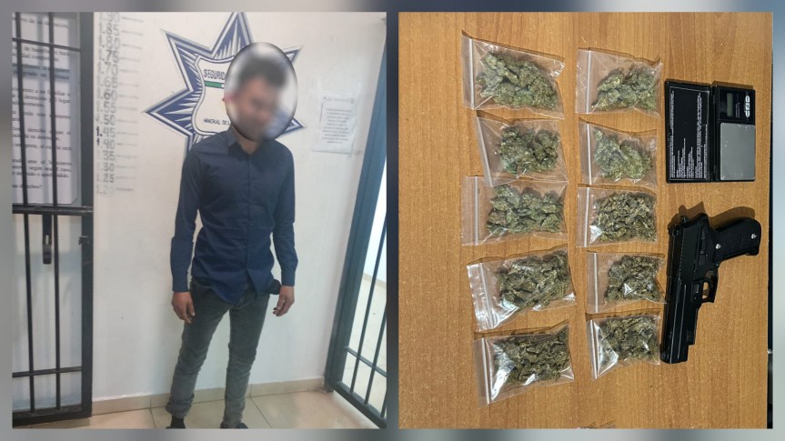 Durante la inspección preventiva, los agentes localizaron una réplica de arma de fuego, así como 10 envoltorios de plástico que contenían hierba con características propias de la marihuana, con un peso aproximado total de 76.6 gramos.