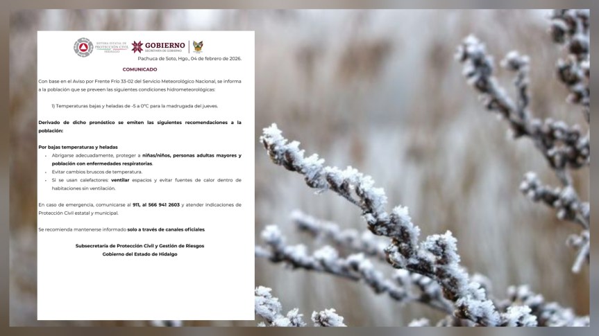 La Subsecretaría de Protección Civil y Gestión de Riesgos del Gobierno del Estado de Hidalgo informó que, con base en el Aviso por Frente Frío 33-02 del Servicio Meteorológico Nacional, se prevé un marcado descenso de temperatura durante la madrugada del jueves, con valores que podrían oscilar entre -5 y 0 grados Celsius en diversas regiones de la entidad.