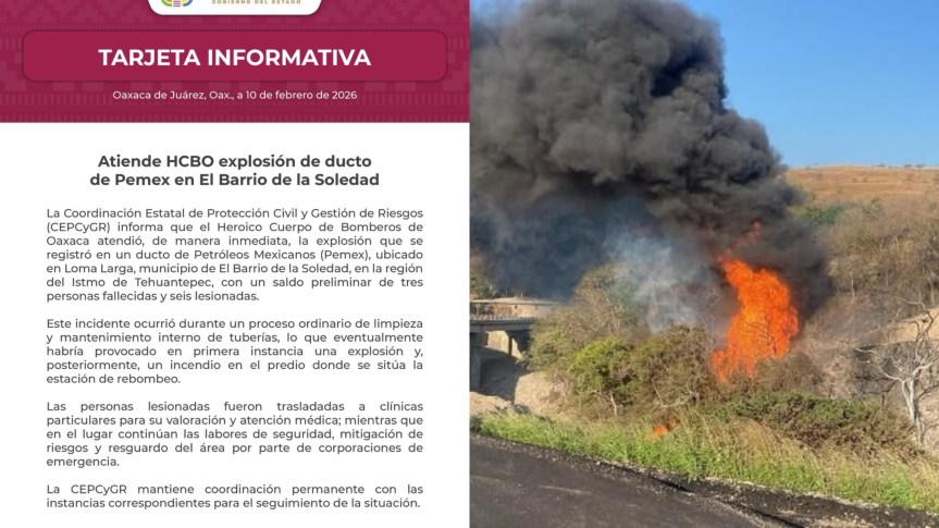 Una explosión seguida de un incendio en un ducto de Petróleos Mexicanos (Pemex) dejó un saldo preliminar de tres personas fallecidas y seis más lesionadas en la comunidad de Loma Larga, municipio de El Barrio de la Soledad, en la región del Istmo de Tehuantepec, Oaxaca.