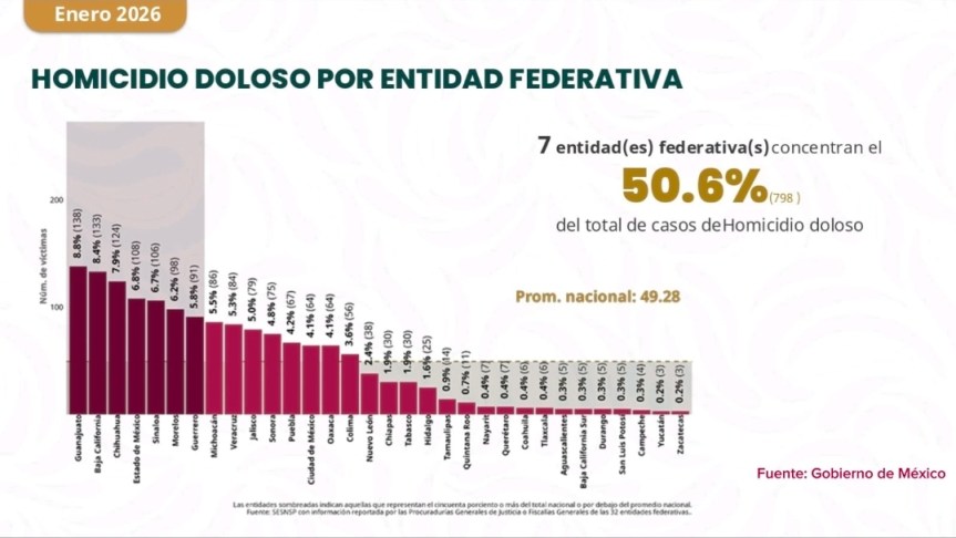 De acuerdo con la información expuesta, siete entidades federativas concentran el 50.6 por ciento del total nacional de homicidios dolosos. En contraste, Hidalgo se ubica en la posición 19 a nivel nacional, con el 1.9 por ciento del total de los casos, por debajo del promedio nacional, lo que refleja una incidencia contenida y un comportamiento estable en este delito de alto impacto.