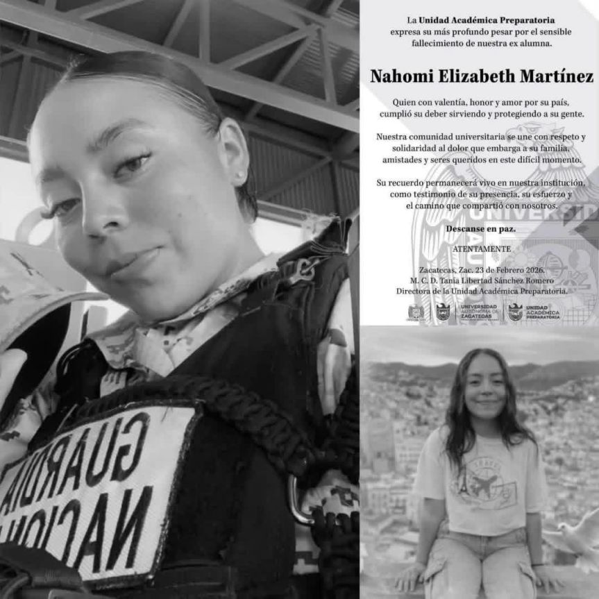 Nahomi Elizabeth Martínez, elemento de la Guardia Nacional y originaria de Guadalupe, murió durante un operativo federal realizado el domingo 22 de febrero de 2026 en Tapalpa, donde fuerzas de seguridad enfrentaron a integrantes del Cártel Jalisco Nueva Generación (CJNG).