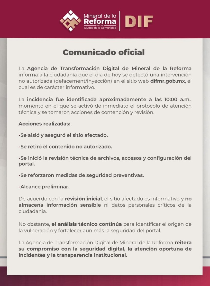 La Agencia de Transformación Digital de Mineral de la Reforma informó que este lunes se detectó una intervención no autorizada en el sitio web difmr.gob.mx, portal de carácter informativo vinculado al sistema DIF municipal.