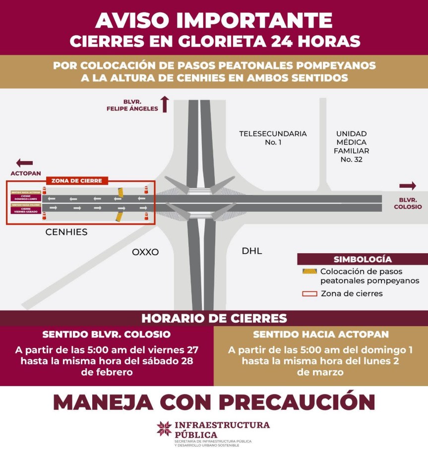 De acuerdo con información oficial, el cierre se realizará en el tramo que conecta hacia la salida a Actopan, donde se llevarán a cabo labores para la construcción de pasos peatonales tipo pompeyano, con el objetivo de mejorar la seguridad vial y reducir riesgos para peatones en uno de los puntos con mayor carga vehicular de la capital hidalguense.