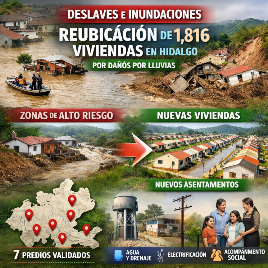 El Gobierno de Hidalgo confirmó la reubicación de mil 816 viviendas que resultaron afectadas por las intensas lluvias registradas en octubre del año pasado, fenómeno que provocó inundaciones, deslaves y daños estructurales en distintos municipios de la entidad.