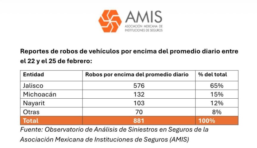 La Asociación Mexicana de Instituciones de Seguros (AMIS) informó que aumentó a 881 el número de vehículos asegurados que registraron siniestros por robo y daños en distintos estados del país tras los hechos violentos relacionados con la captura y muerte de “El Mencho”.