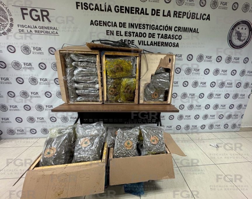 De acuerdo con la Fiscalía General de la República, el aseguramiento ocurrió sobre la carretera Villahermosa–Frontera, en dirección a Ciudad del Carmen, donde autoridades detectaron un tractocamión con caja seca que transportaba diversas cajas de cartón y madera envueltas con plástico.