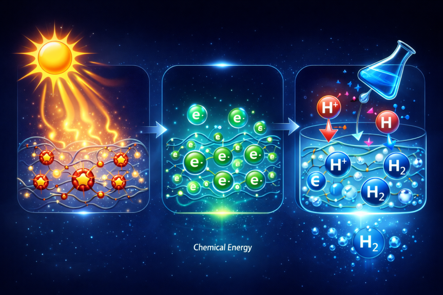 El proceso funciona en tres etapas. Primero, el material captura la luz solar gracias al colorante fotosensible. Después, los electrones energizados quedan atrapados dentro del polímero, donde permanecen almacenados. Finalmente, al modificar el nivel de acidez del sistema —añadiendo ácido— los electrones reaccionan con protones y generan hidrógeno.