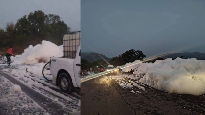 Una densa acumulación de espuma blanca cubrió parte de la carretera que conecta los municipios de Chilcuautla y Alfajayucan, en el Valle del Mezquital, la mañana de este lunes 9 de marzo, lo que generó alarma entre automovilistas y obligó a autoridades a intervenir en la zona.