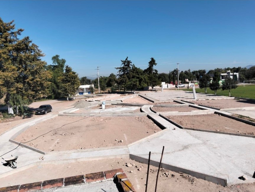 El espacio incluye además una plaza de concreto estampado en color rojo, ubicada frente a las oficinas de la delegación de la localidad, así como obras complementarias como salidas para coladeras y un registro sanitario conectado al sistema de drenaje de la delegación.