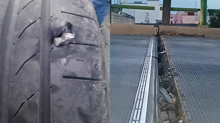 De acuerdo con el reporte ciudadano, el incidente ocurrió al pasar el puente, donde en las juntas metálicas de la estructura una pieza de acero sobresale del pavimento, lo que provocó que se incrustara en la llanta trasera de su camioneta y la dejara inutilizable.